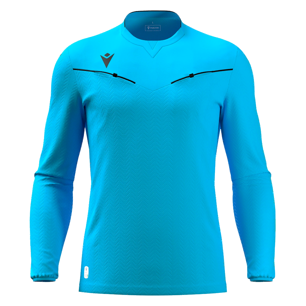 Referee shirt made entirely in Eco-Fabric, obtained from 100% recycled PET. The crew neck has an insert at the front and knit fabric at the back. Eco mesh inserts on the underarms and the back of the neck ensure enhanced breathability. The Macron Hero logo is in silicone. The front and sleeves feature an embossed texture and the shirt has two card pockets with ergonomic design and velcro fastening.