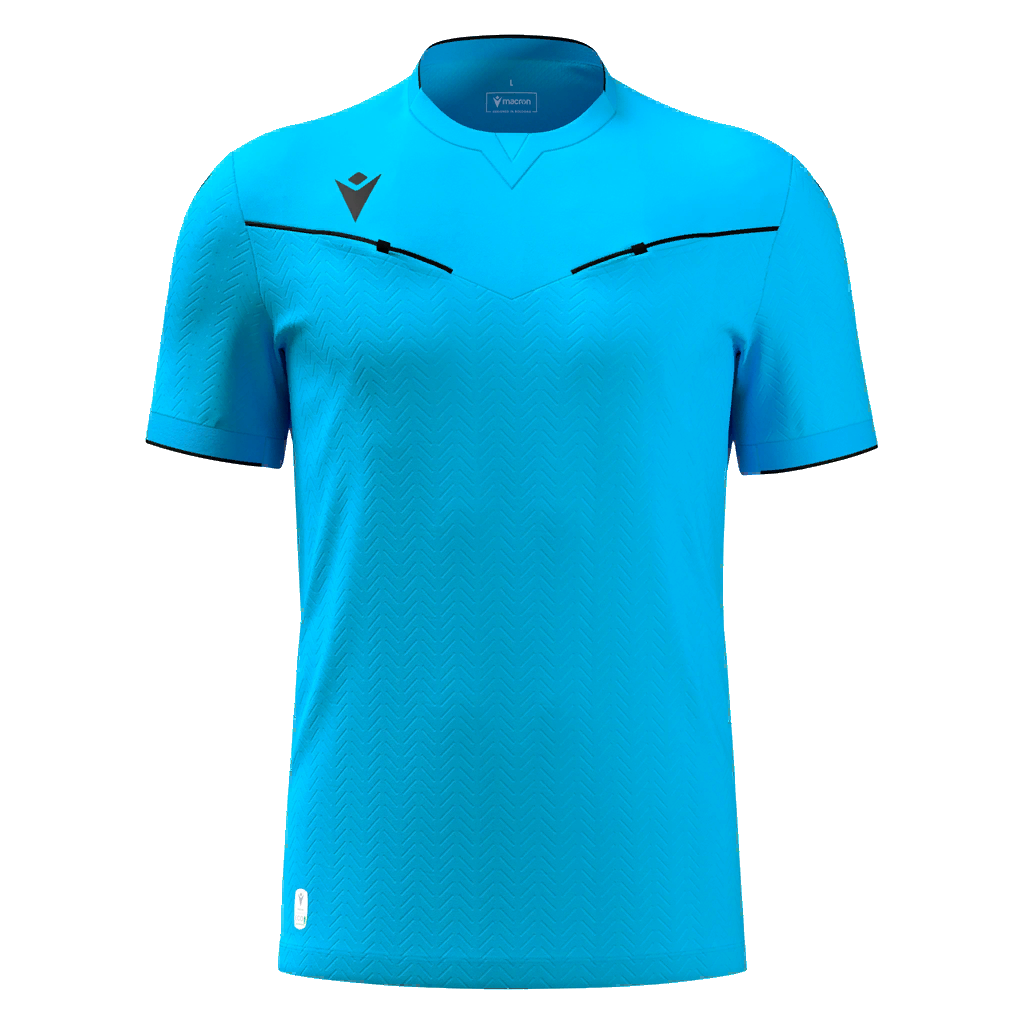 Referee shirt made entirely in Eco-Fabric, obtained from 100% recycled PET. The crew neck has an insert at the front and knit fabric at the back. Eco mesh inserts on the underarms and the back of the neck ensure enhanced breathability. The Macron Hero logo is in silicone. The front and sleeves feature an embossed texture and the shirt has two card pockets with ergonomic design and velcro fastening.